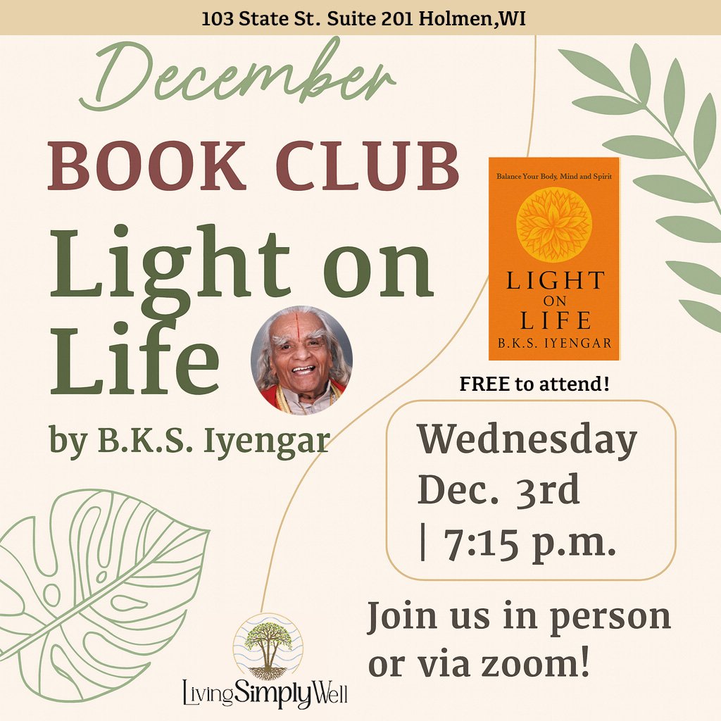 This December, weβll be diving into Light on Life by B.K.S. Iyengar β a beautiful exploration of yoga as a path toward balance, peace, and inner awareness. Whether youβre new to yoga philosophy or simply seeking mindful conversation and connection, this discussion is for you.